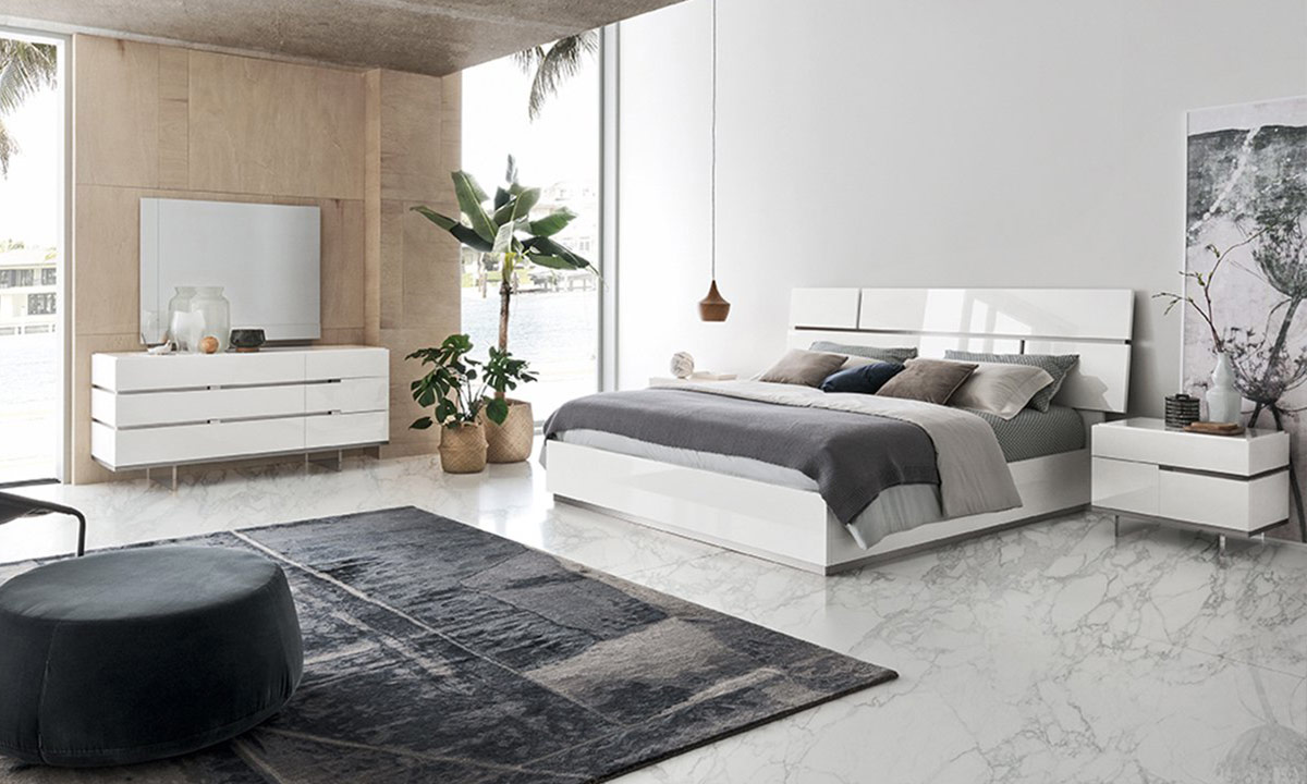 The bed, available in Queen size, King size, California size, 180 size and UK size, features an unusual asymmetrical division of the headboard panel, through slender metal profiles.