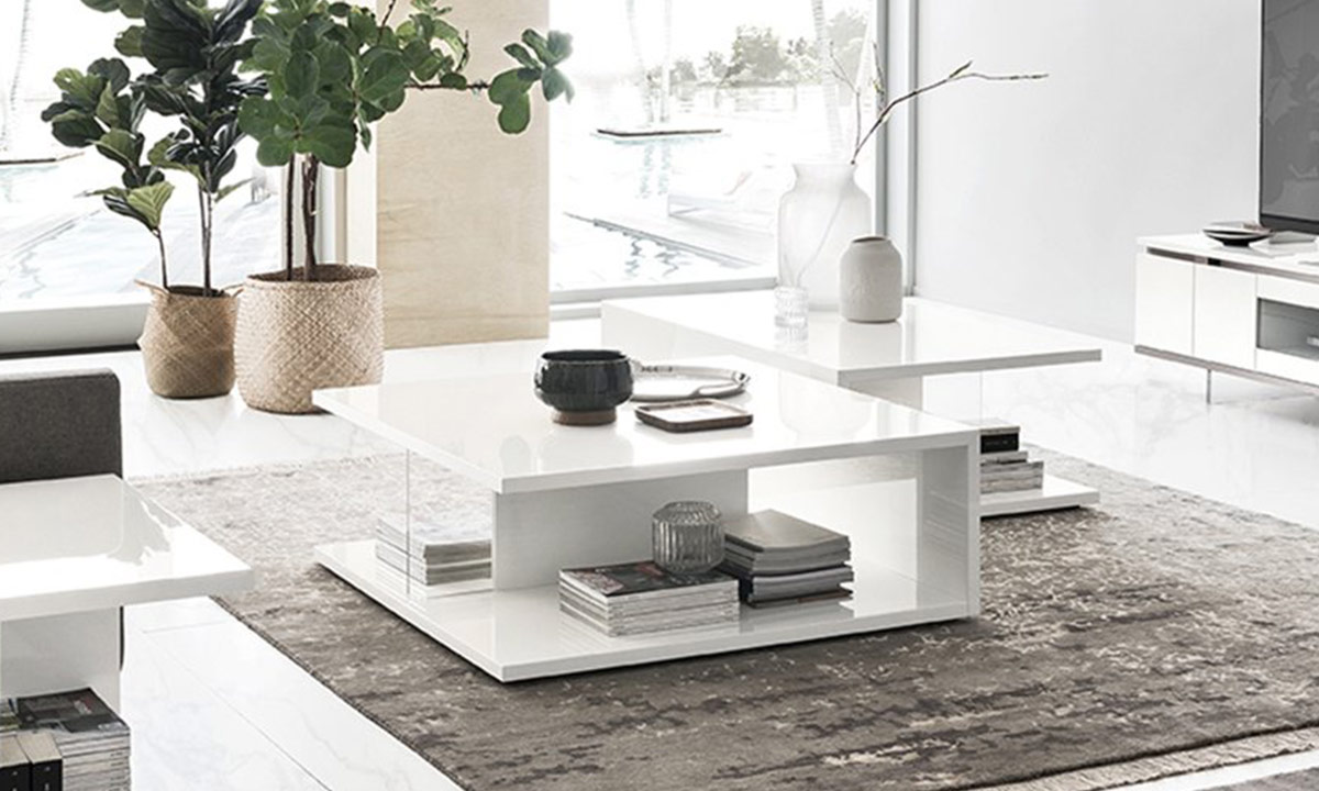 The occasional tables, available in different configurations, stand out for the unusual shape of the clear methacrylate partitions that give the furniture in the collection a feeling of being suspended.