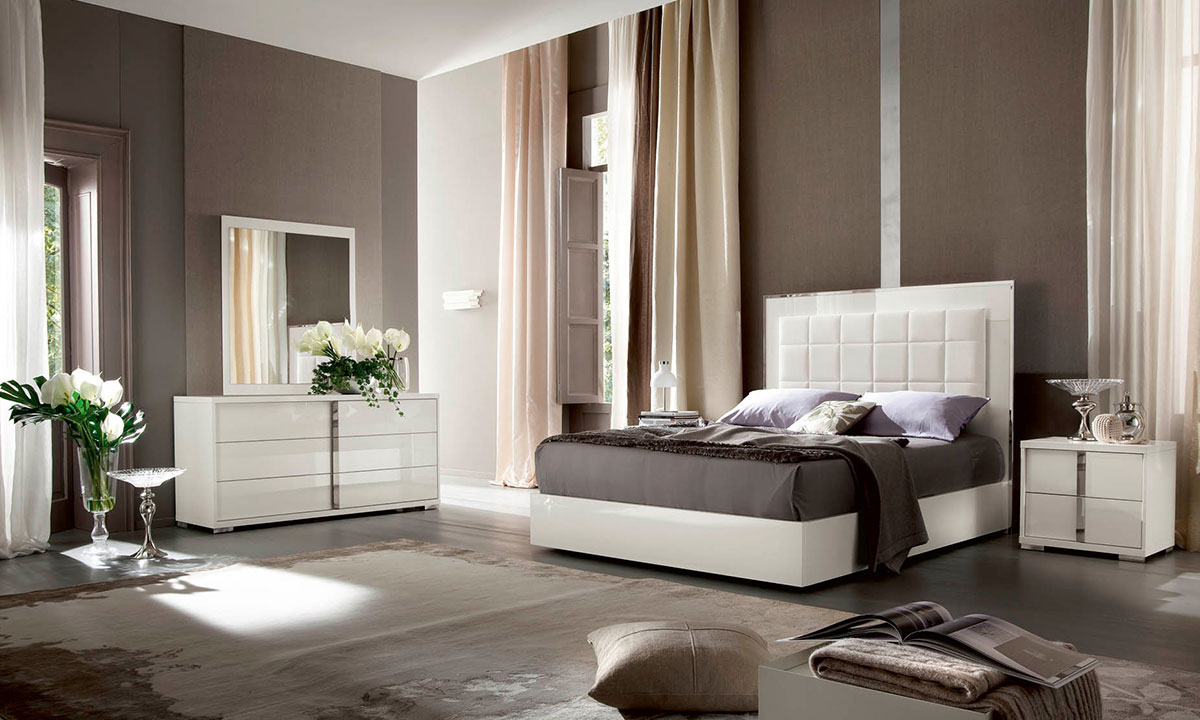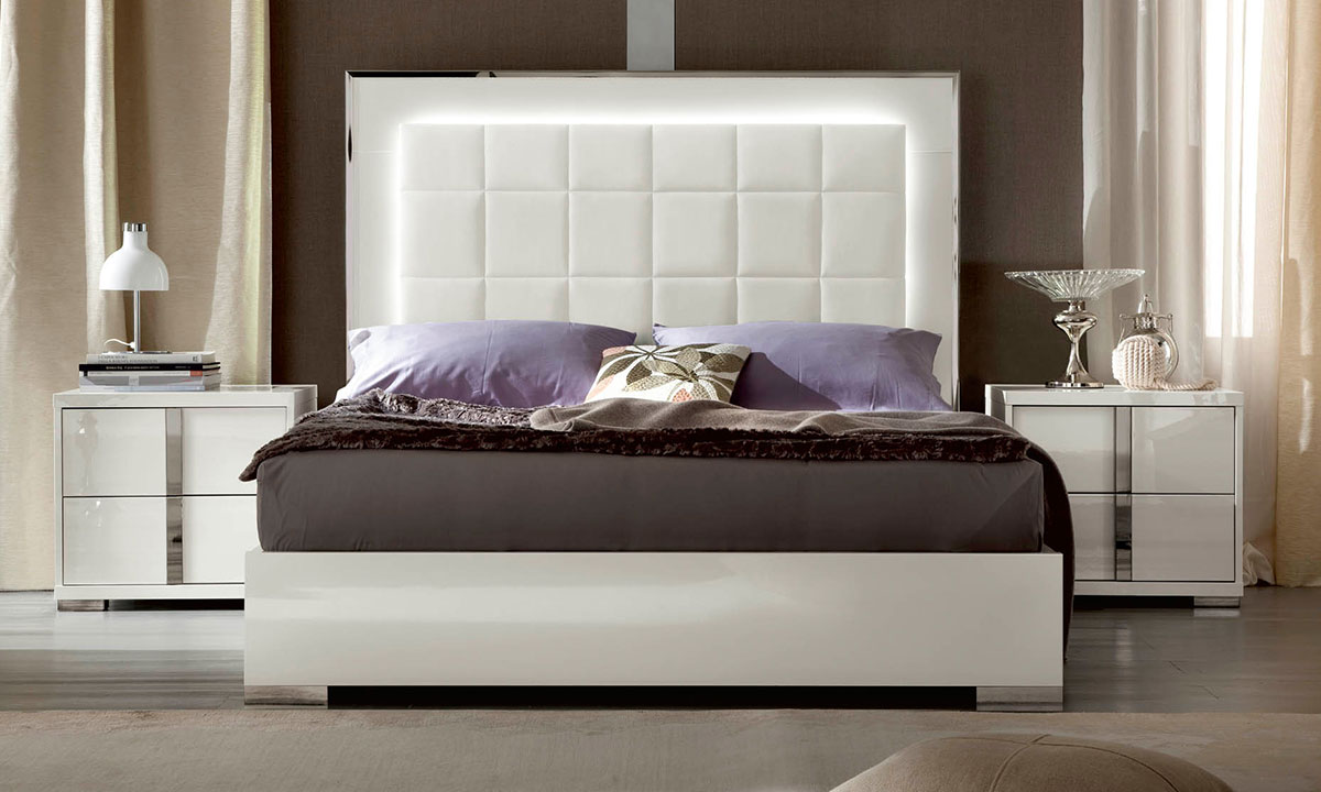 The Imperia Bedroom Set is a very angelic collection that emphasizes timeless and pure contemporary style. The headboard features a leather panel that is surrounded by hidden LED lights. All cabinets feature soft closing drawer glides. Matching case pieces of the Imperia Collection include a wall mirror, two-drawer nightstand, three-drawer dresser, six-drawer chest with easy touch closure, and drawer stops.